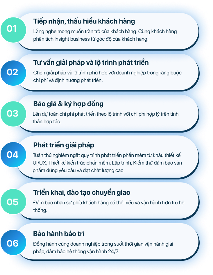 Với chúng tôi, hợp tác không chỉ dừng lại ở giai đoạn phát triển sản phẩm mà chúng tôi luôn đồng hành cùng doanh nghiệp trong suốt quá trình vận hành thực tế, giải đáp xử lý các vấn đề kỹ thuật 24/7